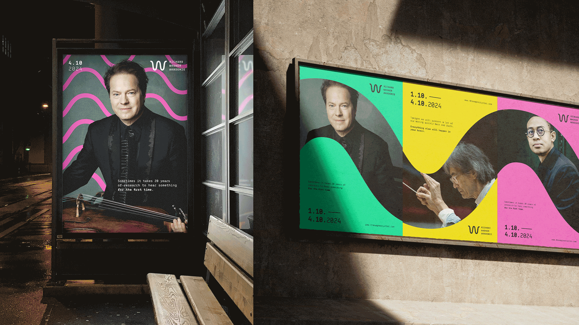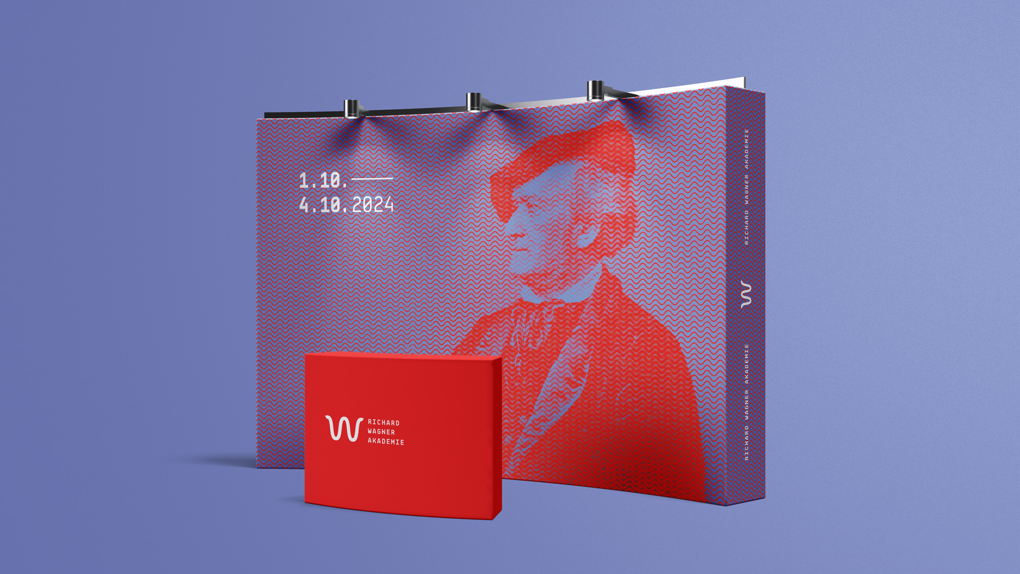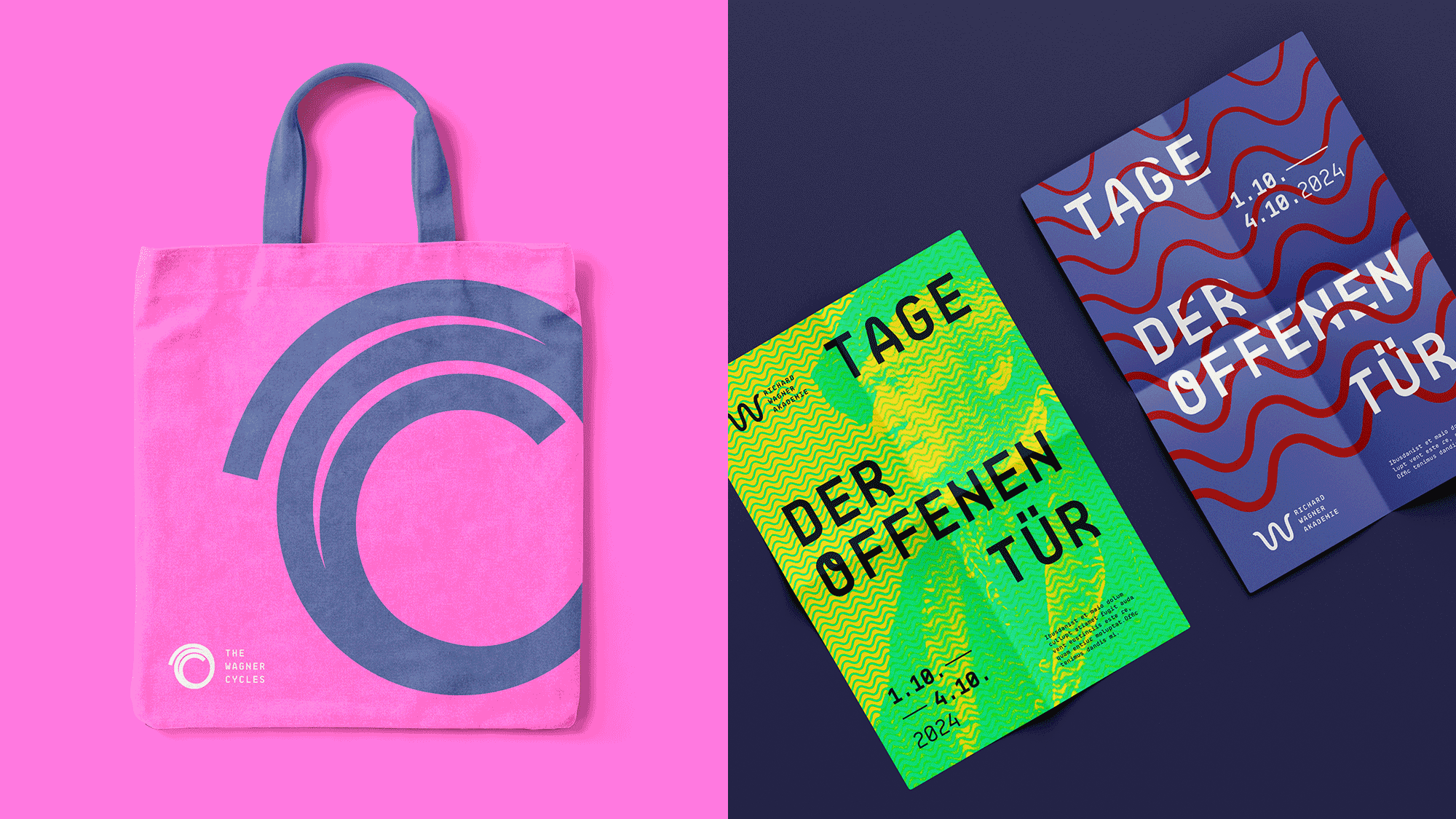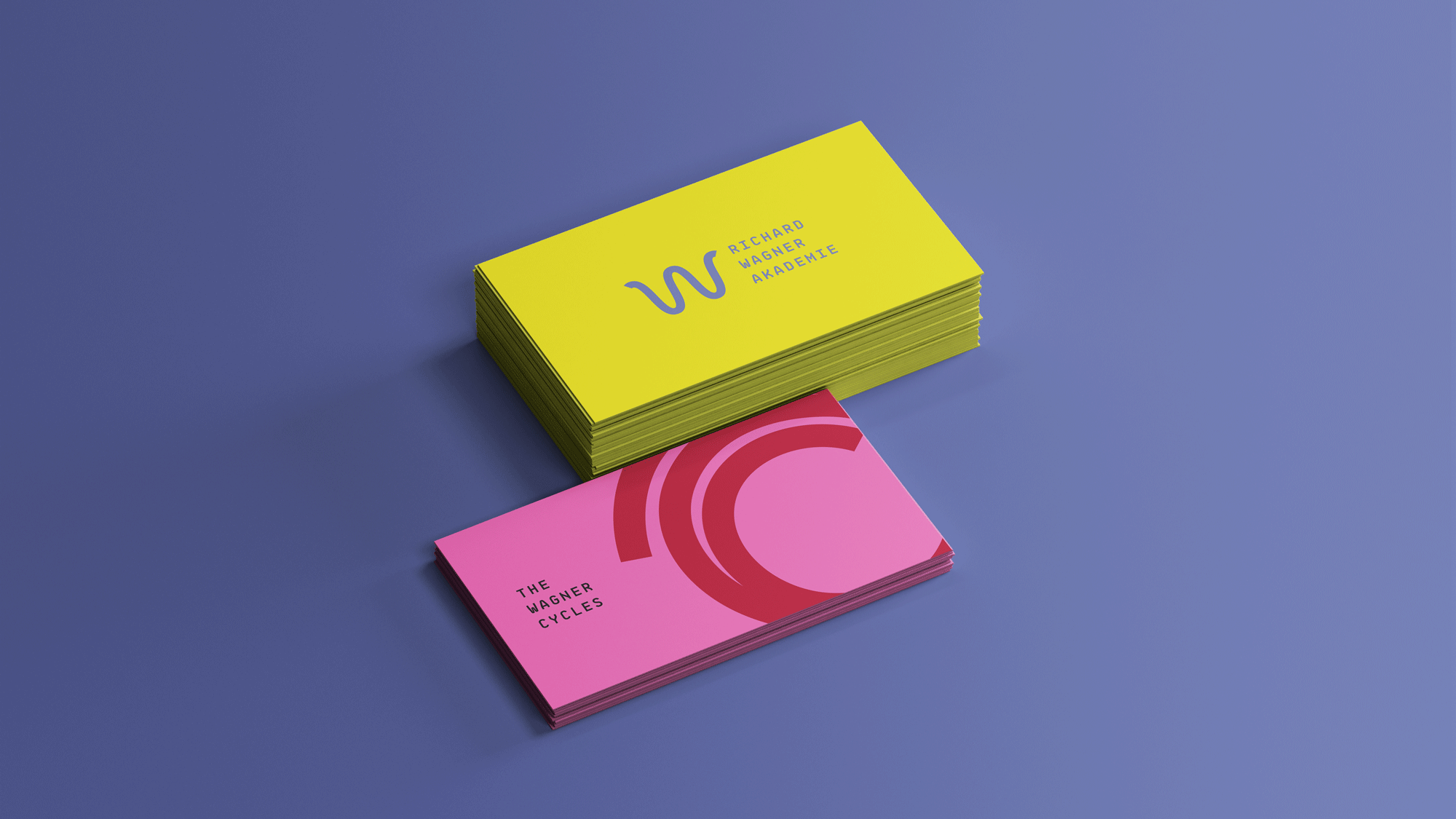 We developed a coherent brand concept with two respective logos, both consisting out of one three-dimensional object, viewed from two angles – frontal and lateral. Looking from the front, you see a spiral, which likewise encloses the "C" for "The Wagner Cycles" as a logo. In the side view, you can see a wave, which takes up the "W" and the "A" in its shape and therefore represents the logo of the Richard-Wagner-Academy.